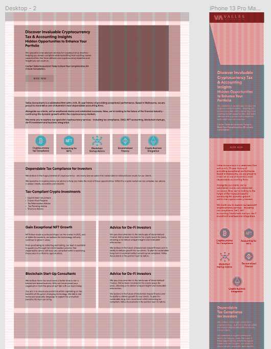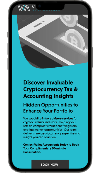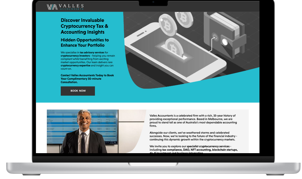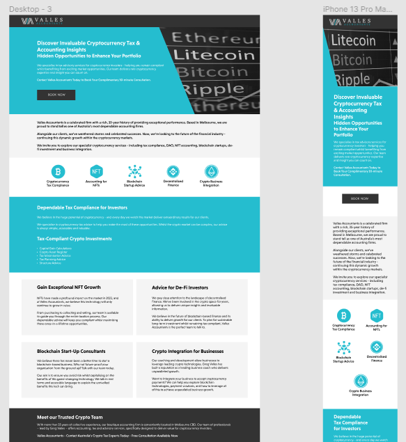 Valles Accountants is an accounting business based in Melbourne who wishes to promote their crypto-tax services to potential clients. Utilising existing brand guidelines and colours, the goal is to create a new landing page to promote their crypto related services that is on par with other competitors and is suitable to their target audience - technological savvy crypto investors.